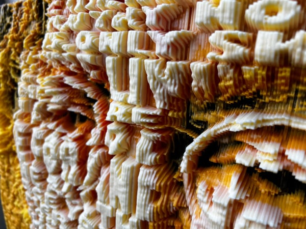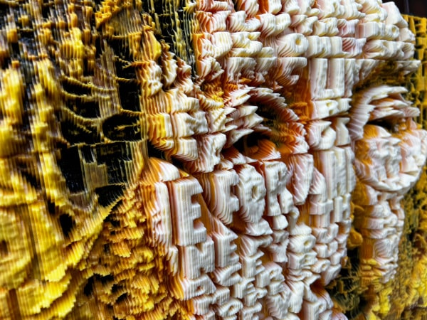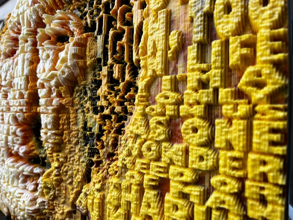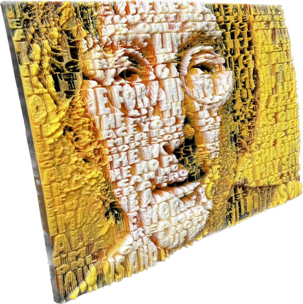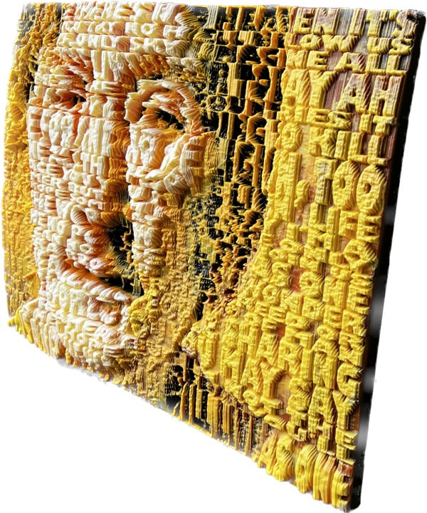 This hanging sculpture features a portrait of John Lennon, formed by embossing and recessing the lyrics to his iconic song Imagine. The three-dimensional face is meticulously crafted, with delicate color placement and control that makes it pop out of the sculpture. This piece captures the essence of Lennon’s creative spirit and his message of peace and love, expressed through the lyrics that define his legacy. This artwork is a fitting tribute to one of the most influential musicians and social activists of our time.