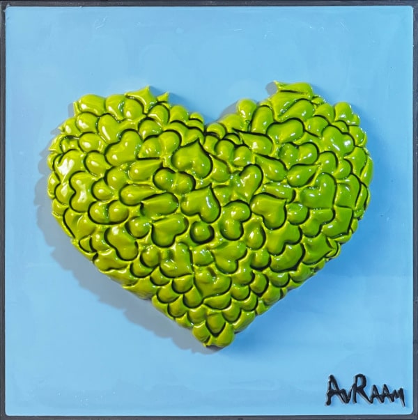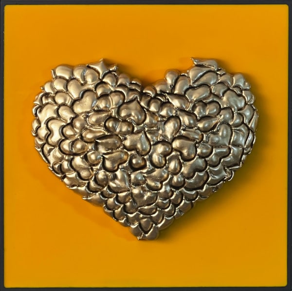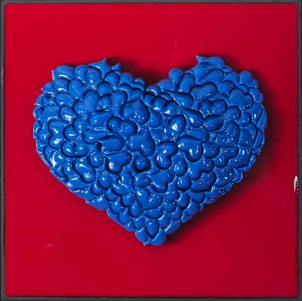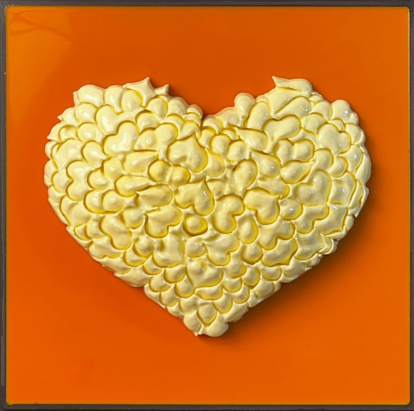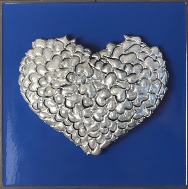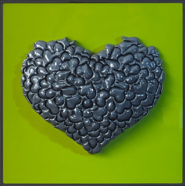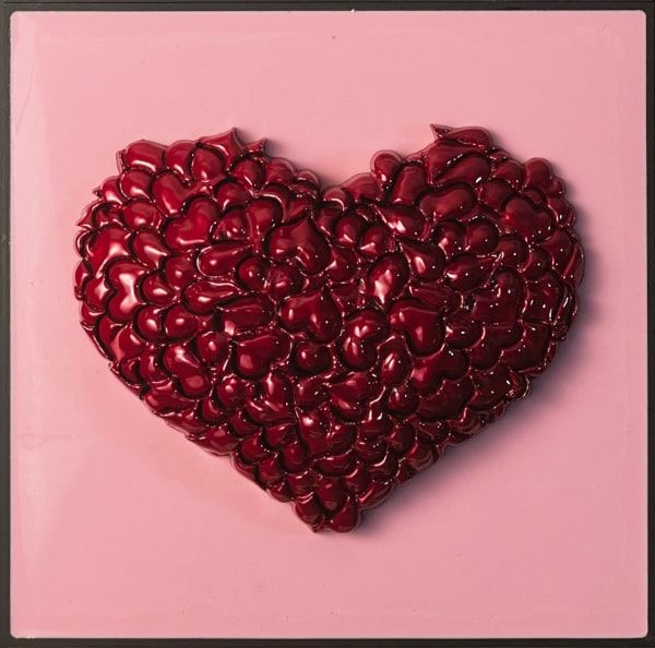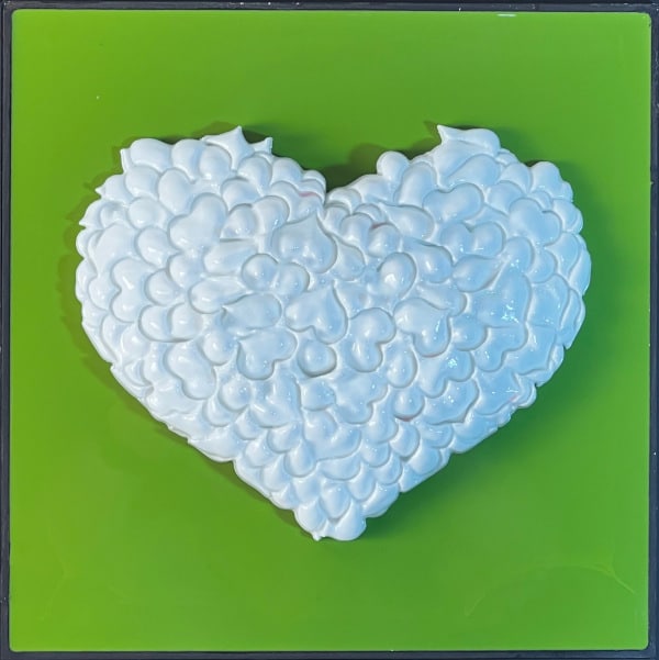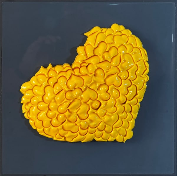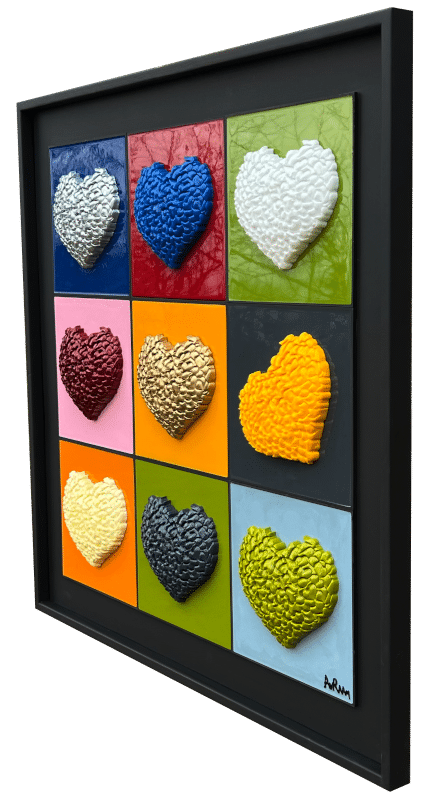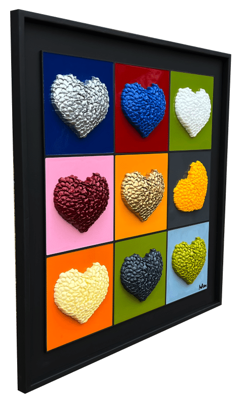 “Perfect No Love” is an exploration into the imperfections that define love and human relationships. This piece is composed of a 3 x 3 grid of tiles, each boasting a unique background color encased in epoxy, with a vibrant, textured heart at its center. These hearts are not singular entities but are intricately formed from numerous small hearts, which the artist refers to as a “Bouquet of Hearts.”