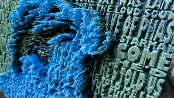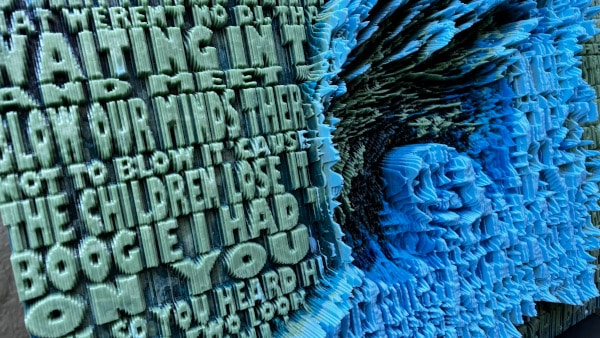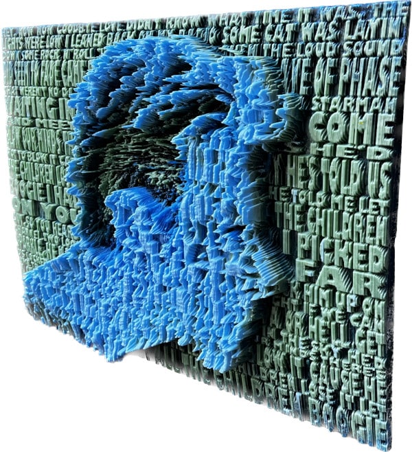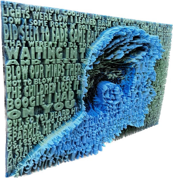 Introducing a captivating wall-mounted sculpture that pays homage to the iconic David Bowie and his beloved song “Starman”. The lyrics gracefully flow across the sculpture, enhancing its depth and texture. Each word and phrase is thoughtfully arranged, creating a harmonious visual representation of the lyrical journey.