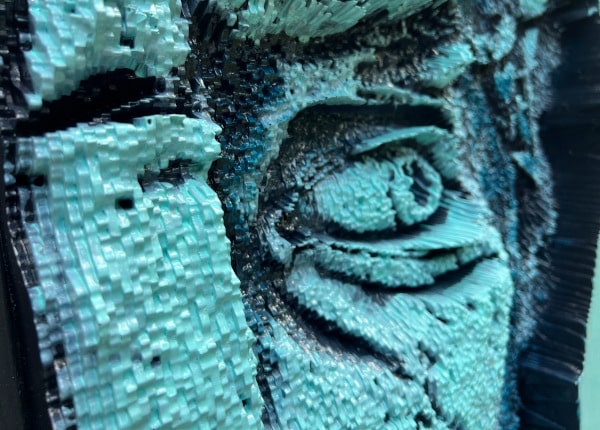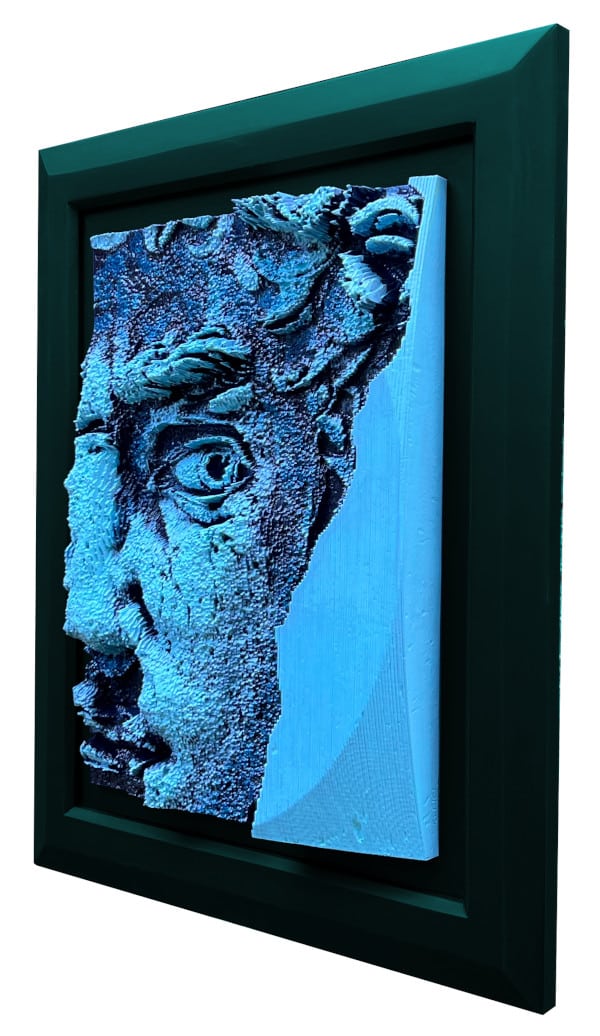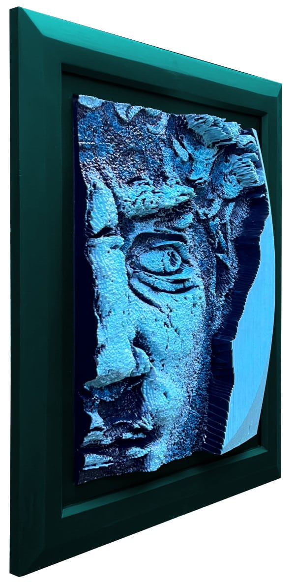 With this piece, I attempted to have my own interpretation of a small portion of Michelangelo’s David statue. Using the same technique of image manipulation and conversion back to 3D representation and compiling layers of 2D flats into a 3D object.