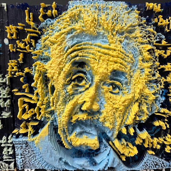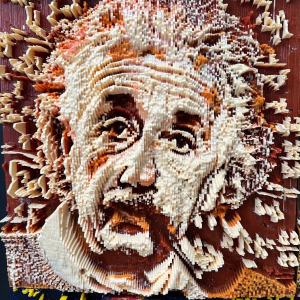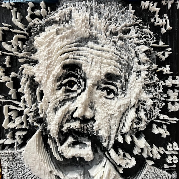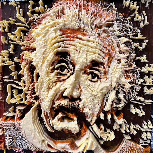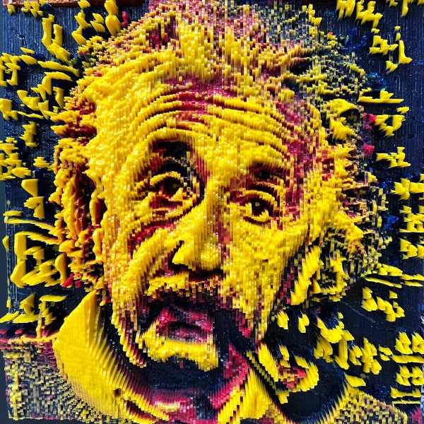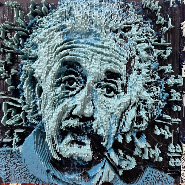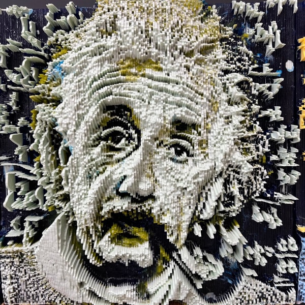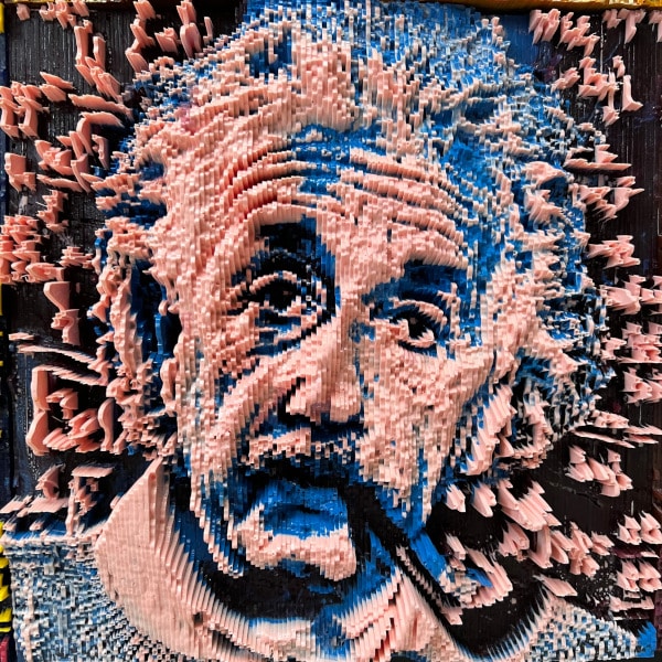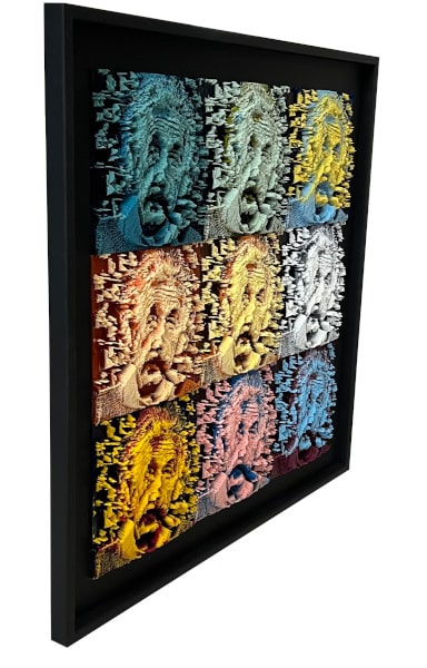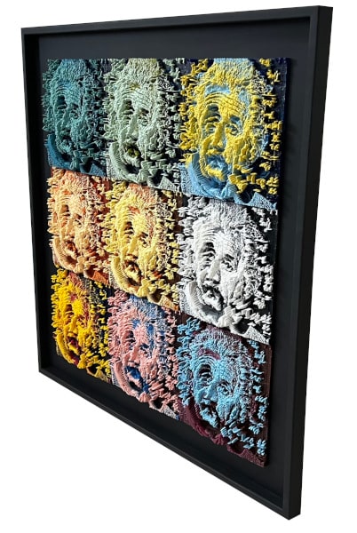 This is the third piece that features Einstein’s iconic face casually staring at the viewer while smoking The Pipe. I added the equations in the background behind him, including the ground-breaking E = mc² .