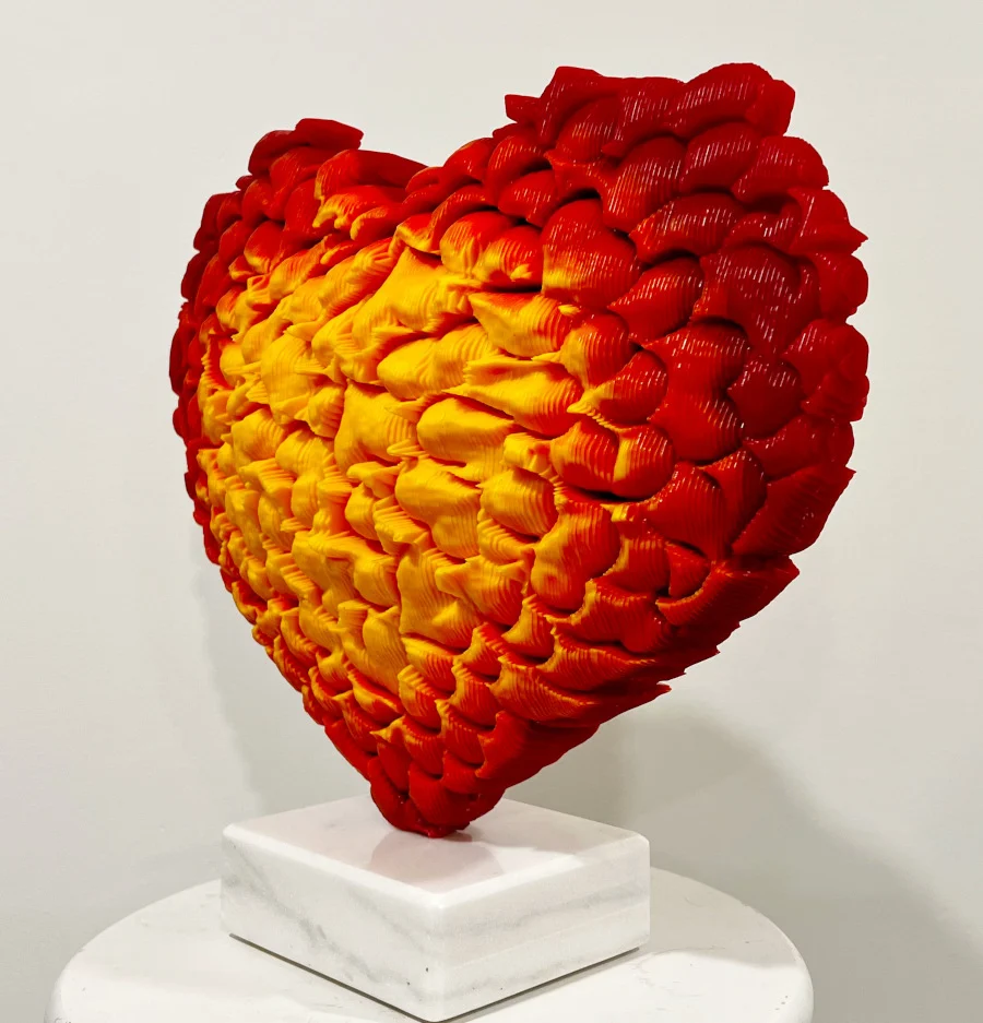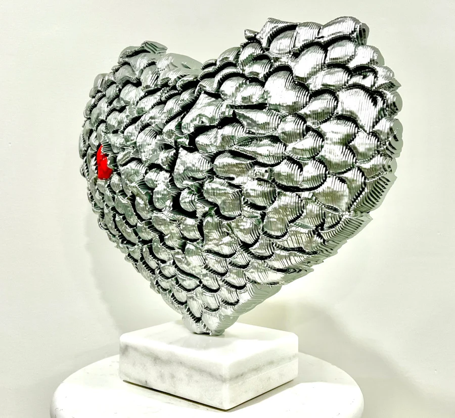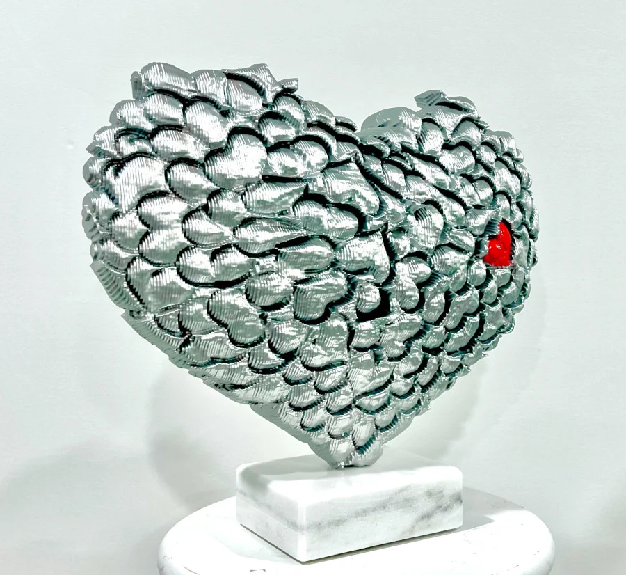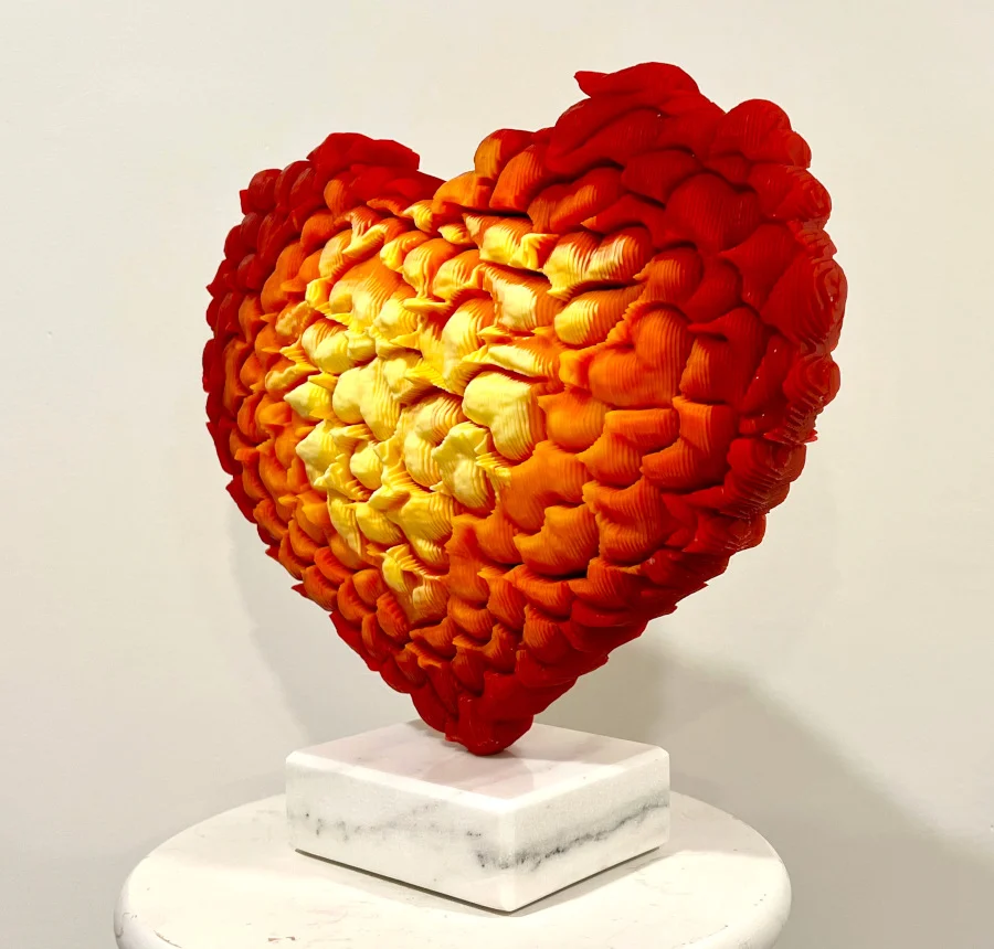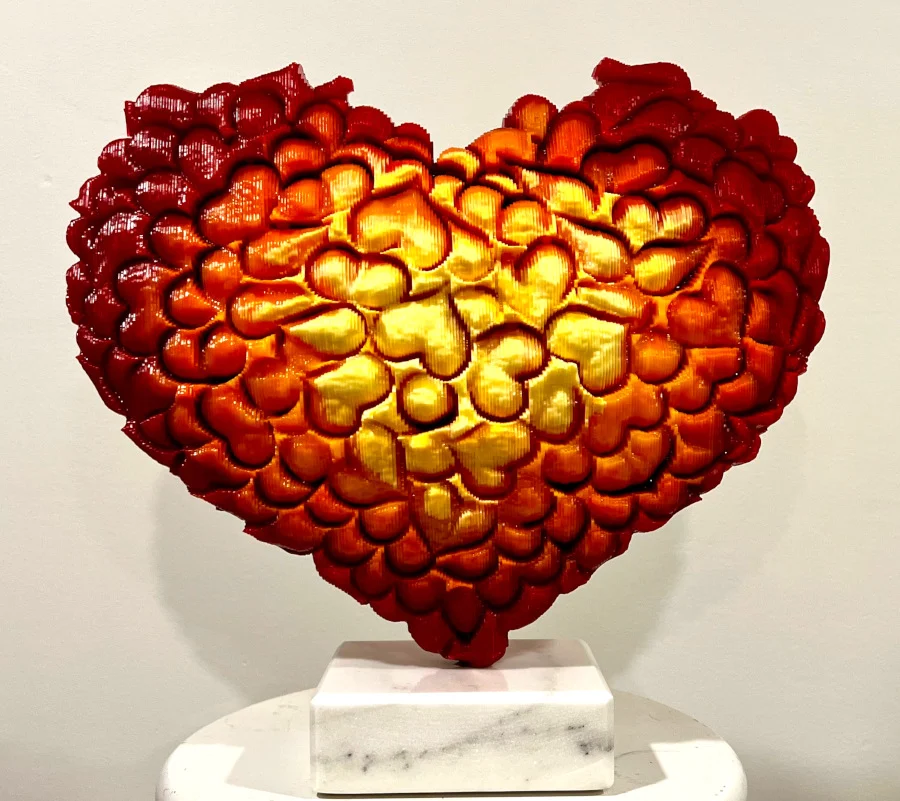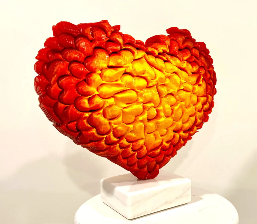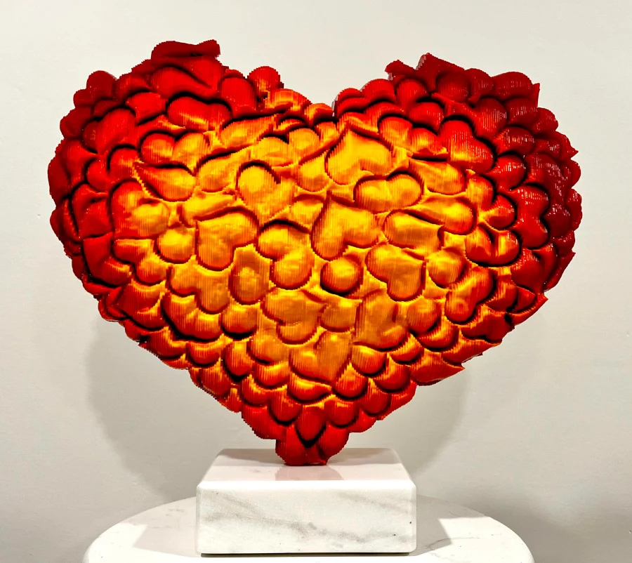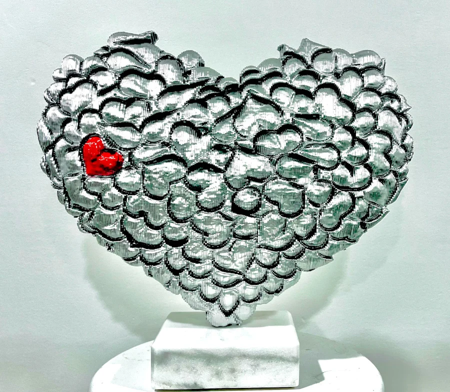 An epoxy sculpture of a collection of multiple hearts in a variety of positions in an overall arrangement in the shape of a heart begs the question, “Is this a Bouquet of Hearts or a Heart Bouquet?”