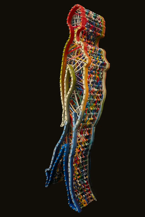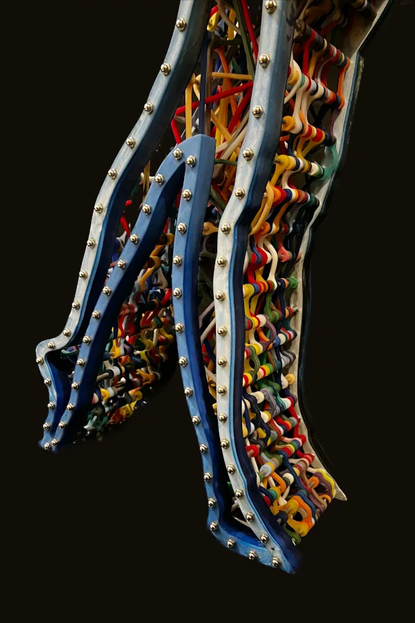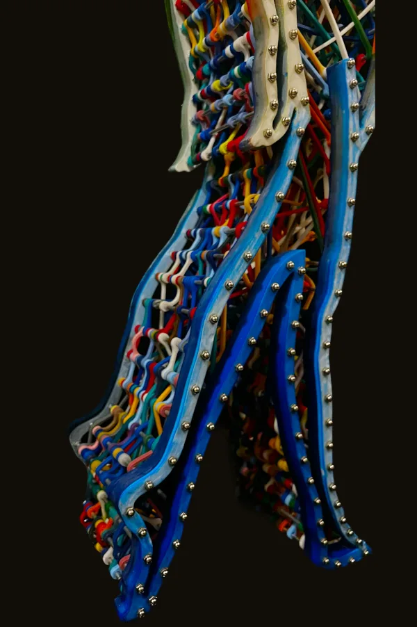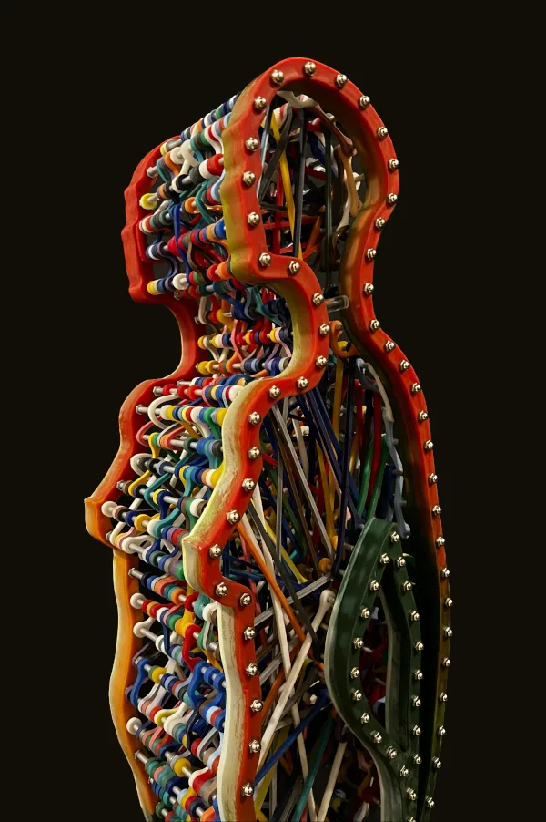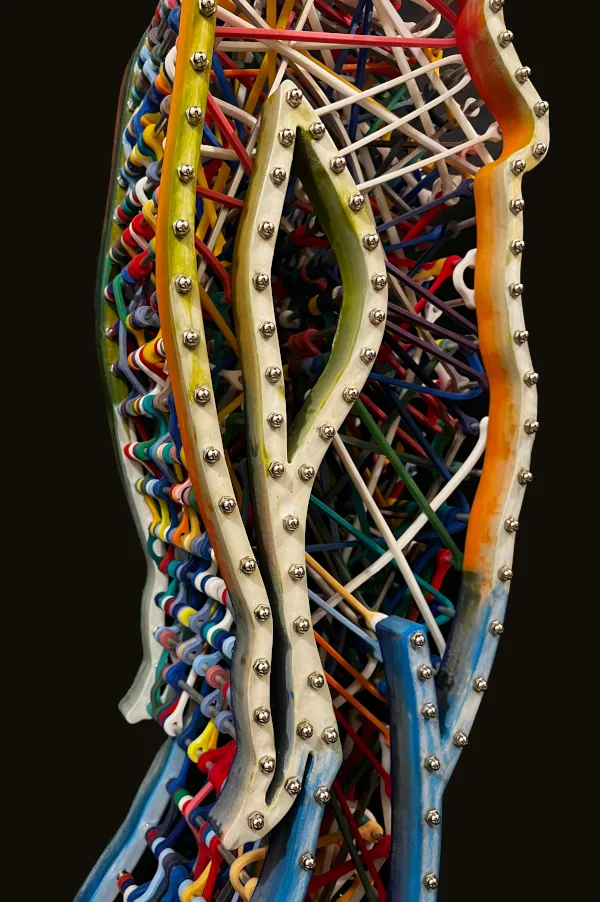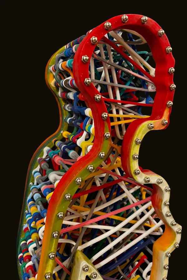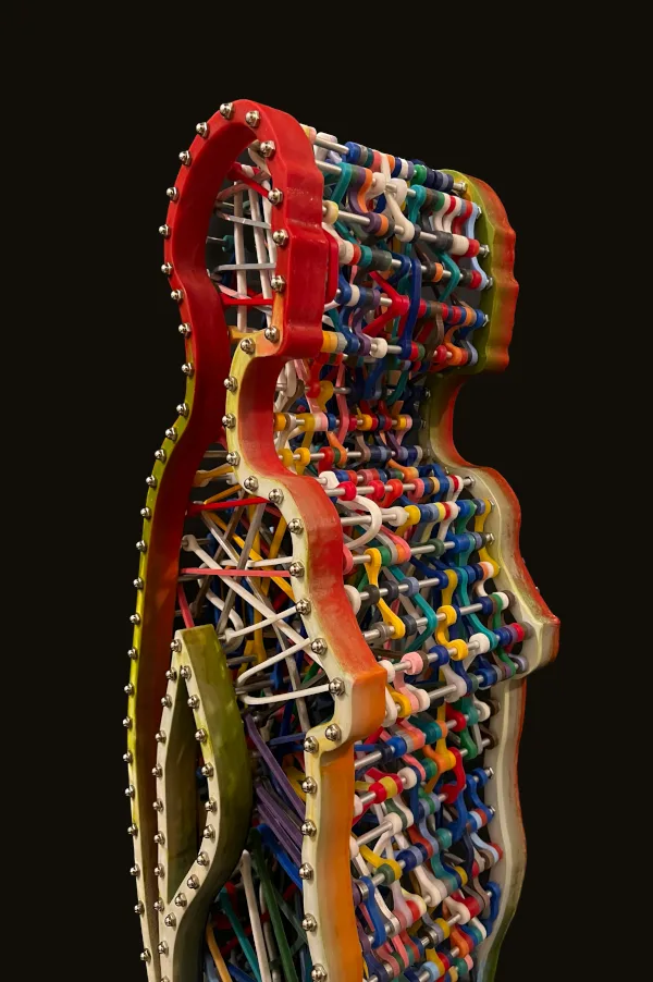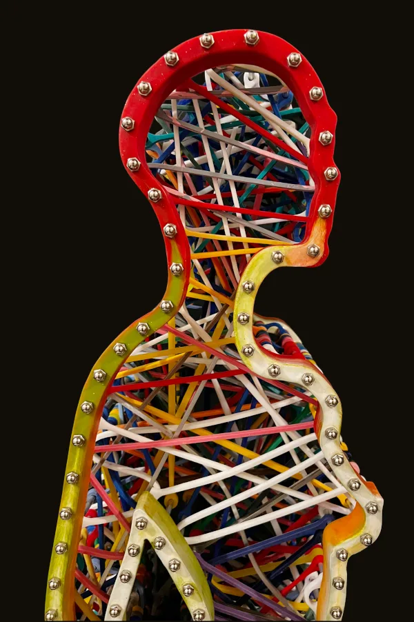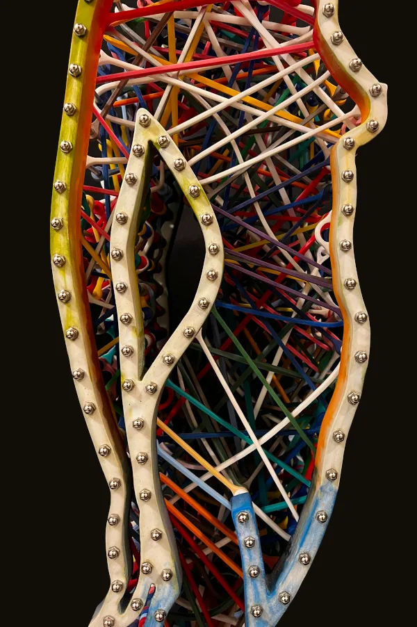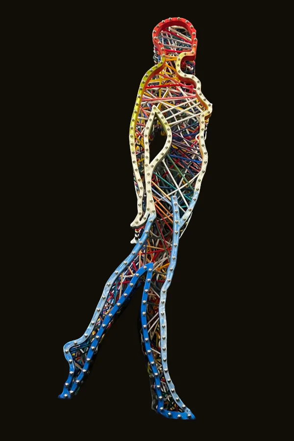 This sculpture features the dynamic silhouette of a dancing woman, brought to life by custom-made elastic bands that stretch across her entire body. The interplay between the stillness of the sculpture and the tension of the rubber bands creates a sense of movement and energy that is both captivating and inspiring. The intricate details of the elastic silicon bands, which have been cast and assembled, add depth and texture to the sculpture, emphasizing the contours and curves of the woman’s body.