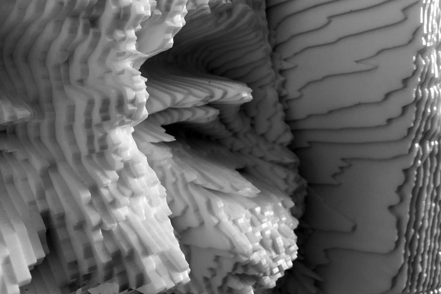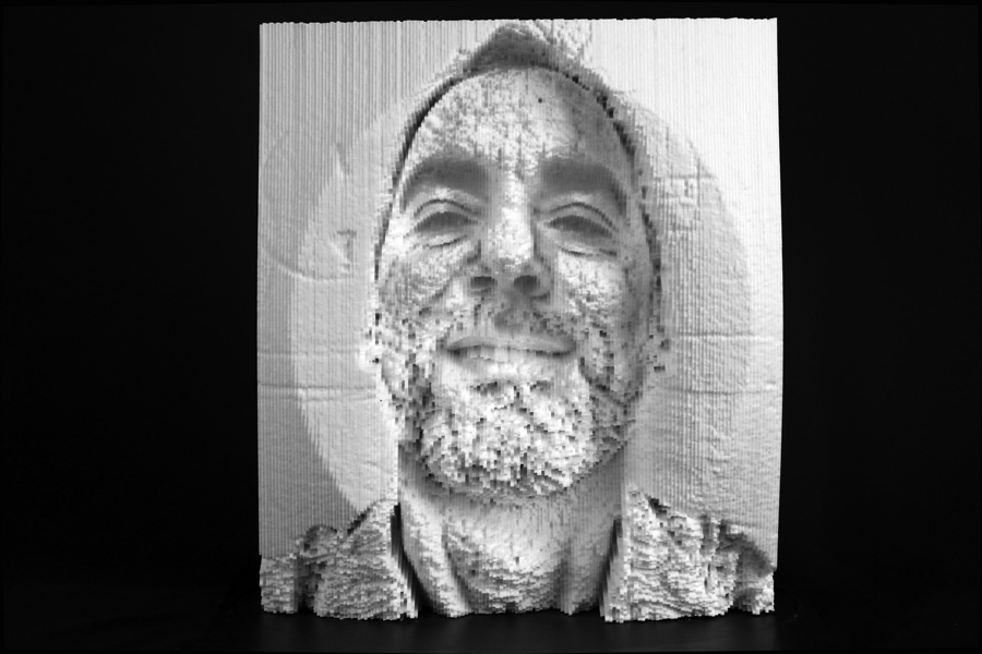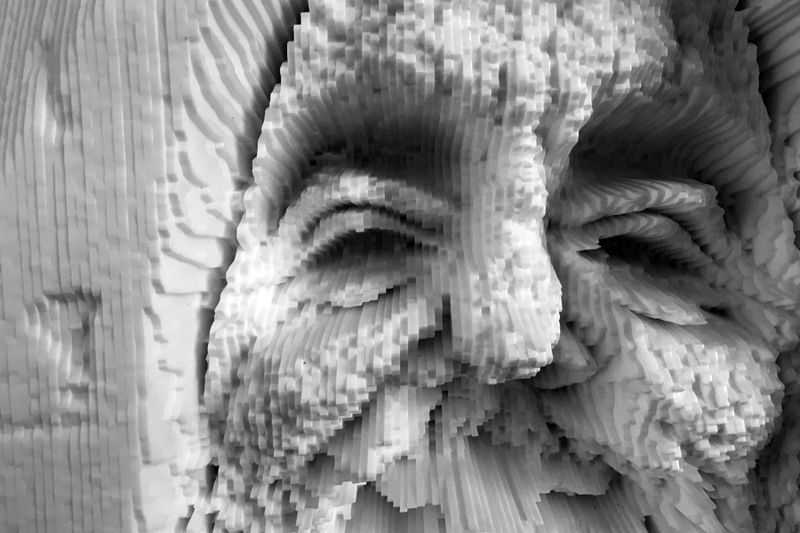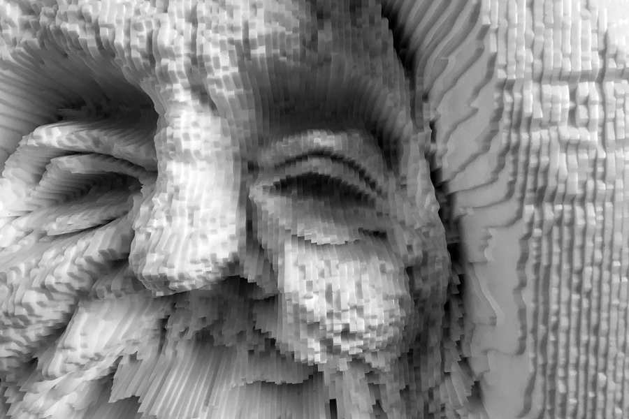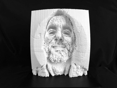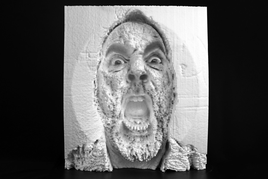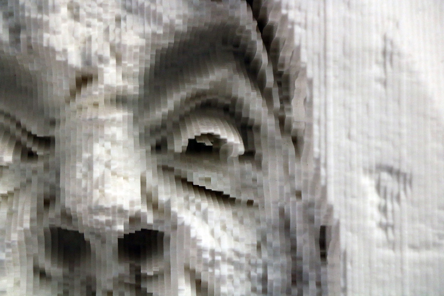 Close inspection reveals the complexity of the facial expression, obscured by the varied topography of the piece, which features deep valleys and high peaks. However, stepping back allows one to perceive a clearer image, as the interplay of light and shadow accentuates the contours of the face, bringing forth the intended expression.