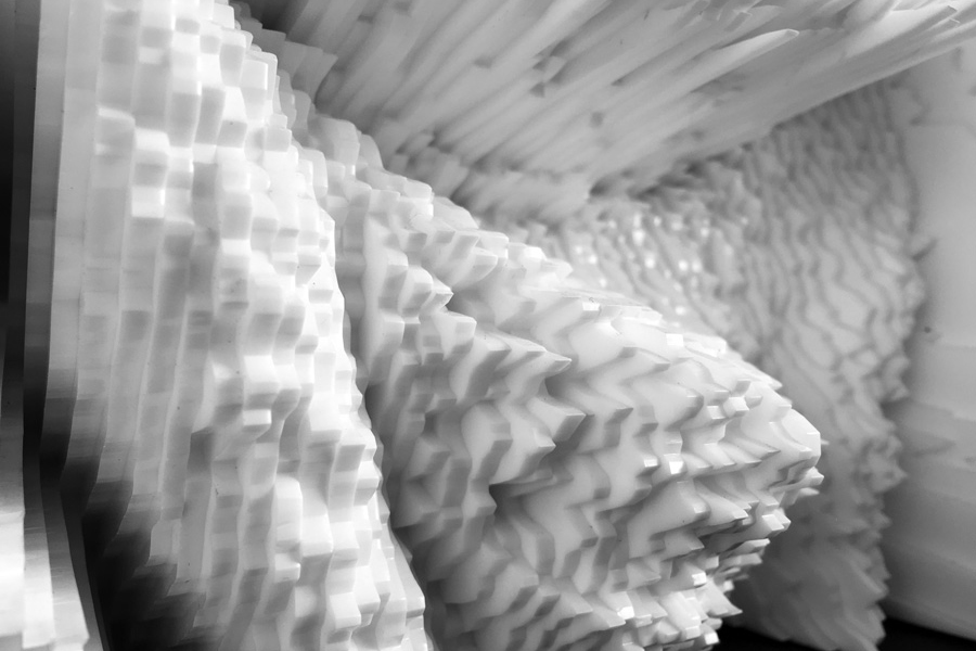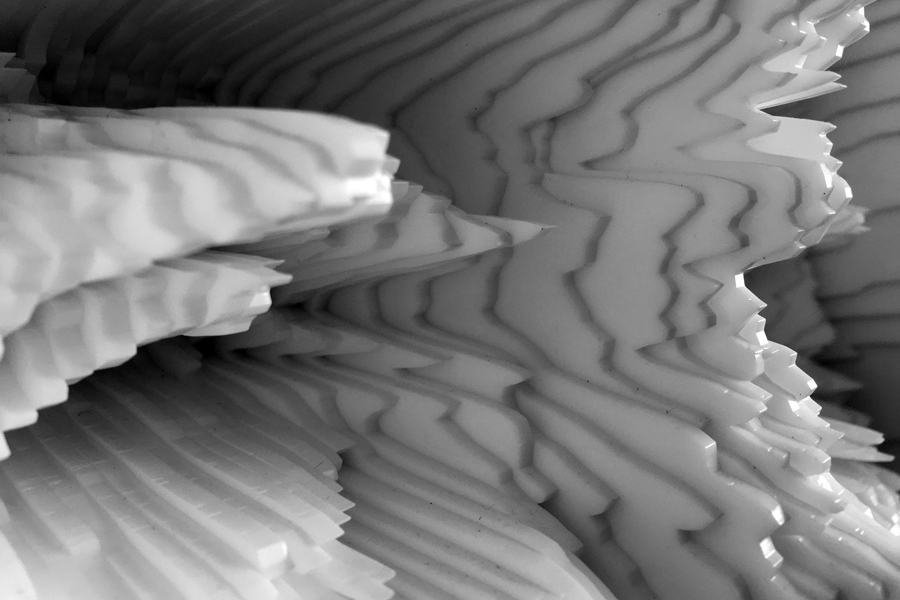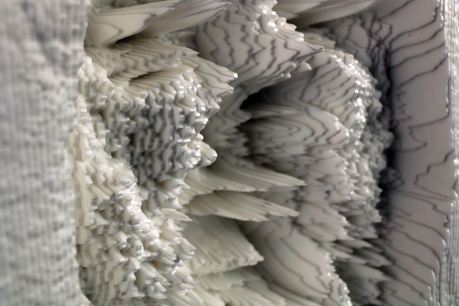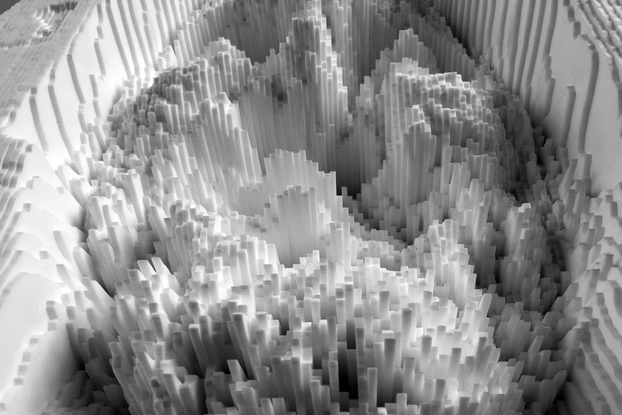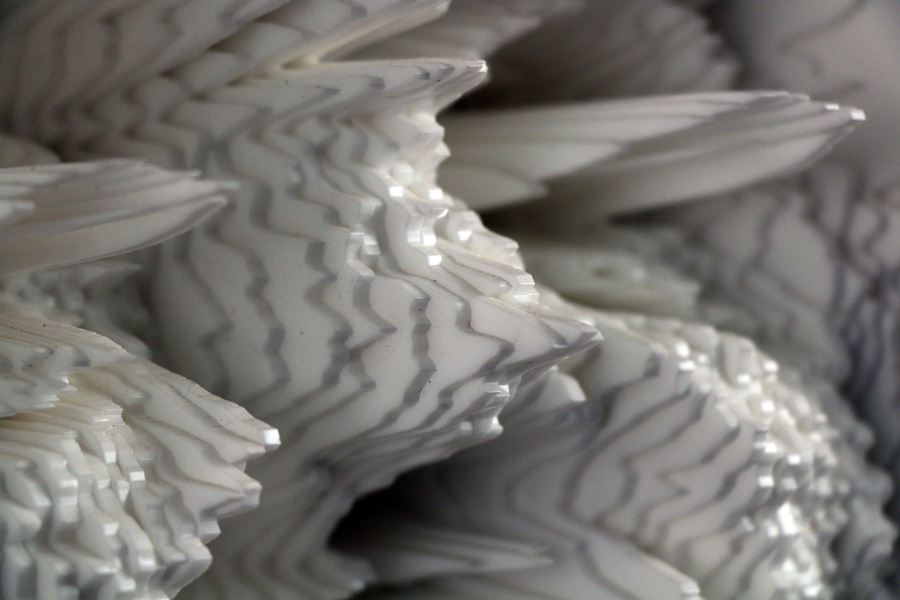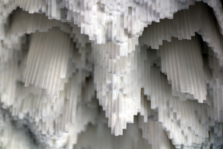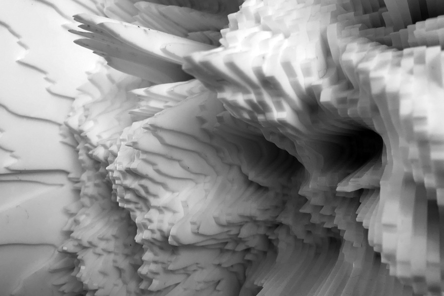 Close inspection reveals the complexity of the facial expression, obscured by the varied topography of the piece, which features deep valleys and high peaks. However, stepping back allows one to perceive a clearer image, as the interplay of light and shadow accentuates the contours of the face, bringing forth the intended expression.