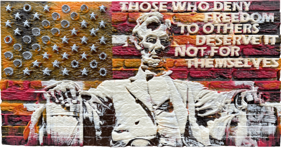 Graffiti-ed onto the flag, Lincoln’s presence sparks a dialogue between historical figures and contemporary challenges, urging us to reflect on the enduring pursuit of freedom.