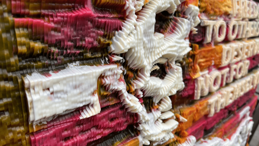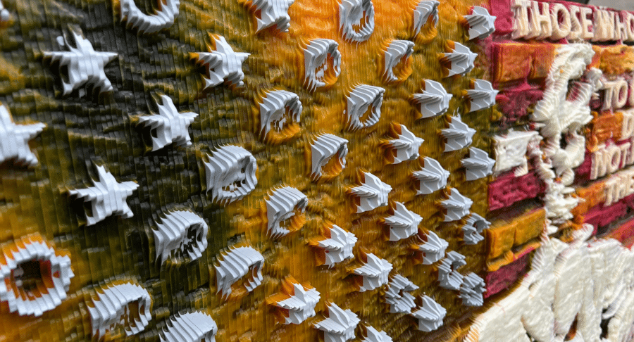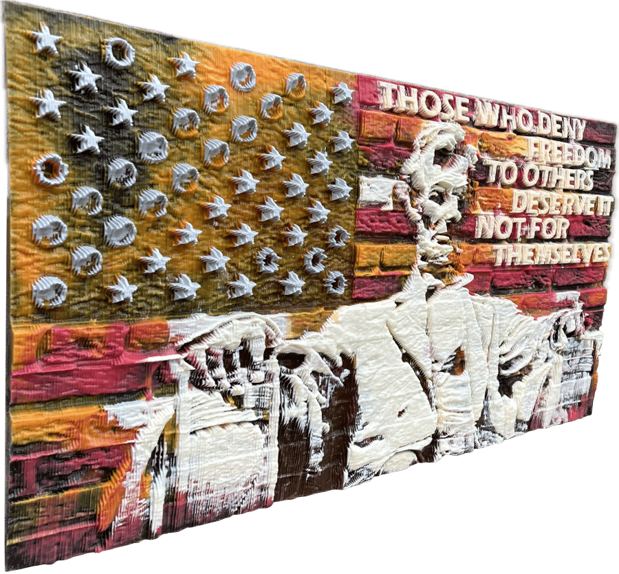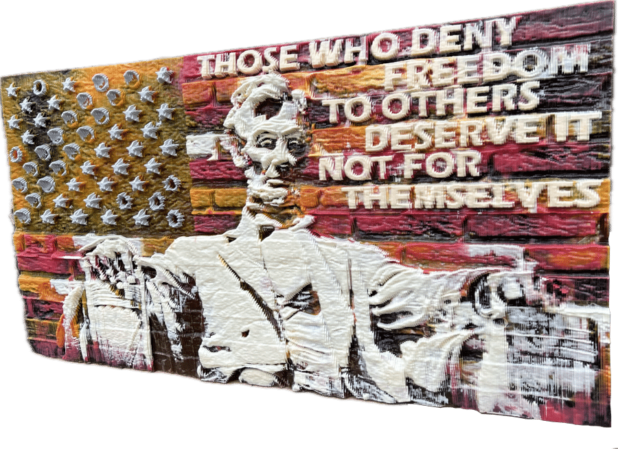 ‘Freedom’ is a wall-hanging sculpture that weaves together the intricate layers of American modern history and ideals. In the heart of this piece, the American flag comes to life with red and white stripes, crafted from the rough texture of a brownstone building wall. Etched within this tactile tapestry are the poignant words, ‘Those Who Deny Freedom to Others Deserve It Not For Themselves,’ a powerful quote attributed to none other than Abraham Lincoln.