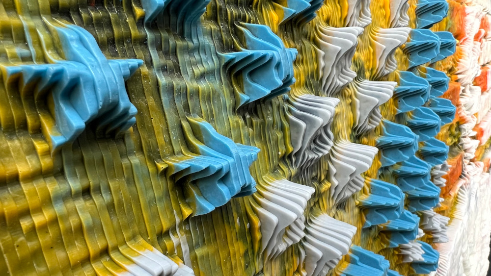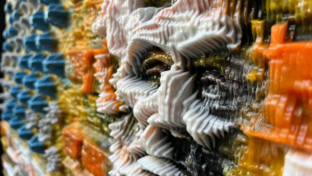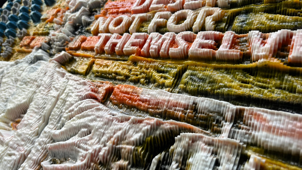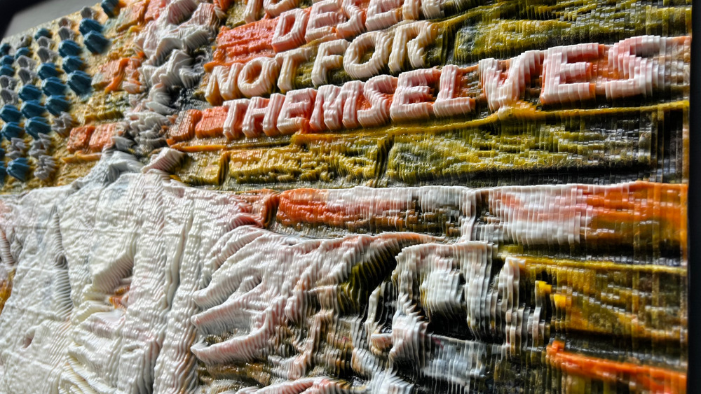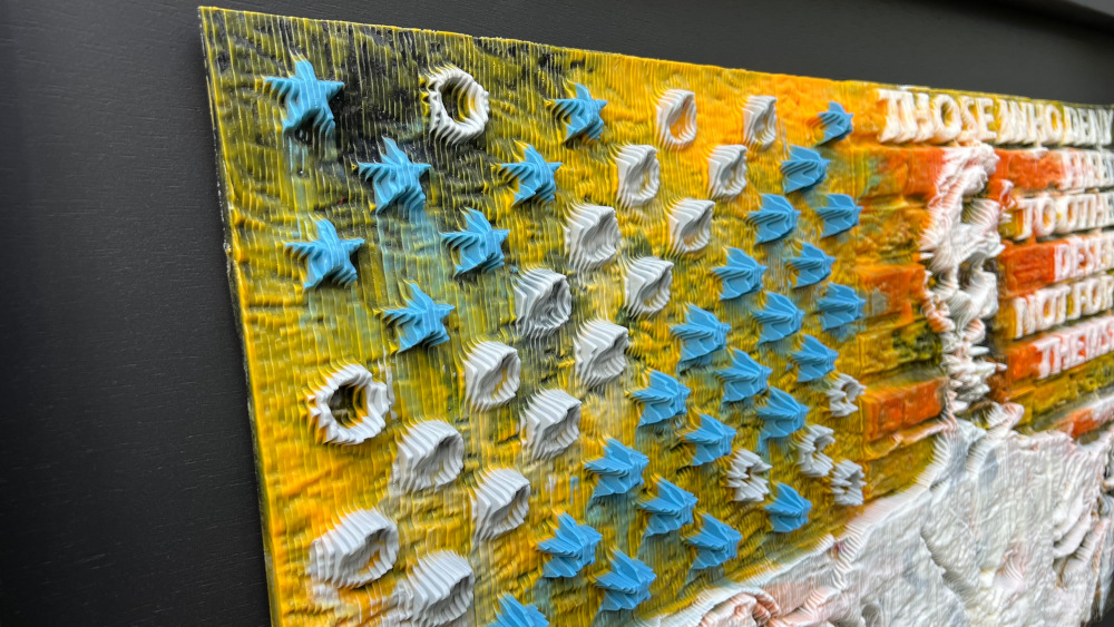 ‘Freedom’ stands as a poignant wall-hanging sculpture intertwining the intricate threads of American history and values. At its core, the American flag is brought to life, its red and white stripes intricately woven from the rugged texture of a brownstone building wall. Within this tactile masterpiece, the profound words of Abraham Lincoln echo: “Those Who Deny Freedom to Others Deserve It Not For Themselves,” etched into the fabric of our collective memory.
