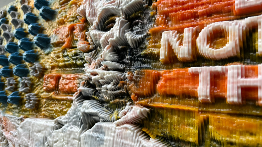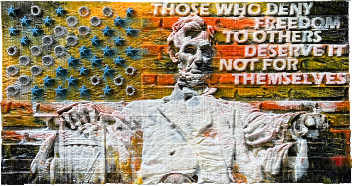 An embossed likeness of Lincoln emerges, evoking the solemnity of the iconic Lincoln Memorial. Graffiti adorns the flag, sparking a conversation between past leaders and present challenges, prompting us to contemplate the enduring quest for freedom.