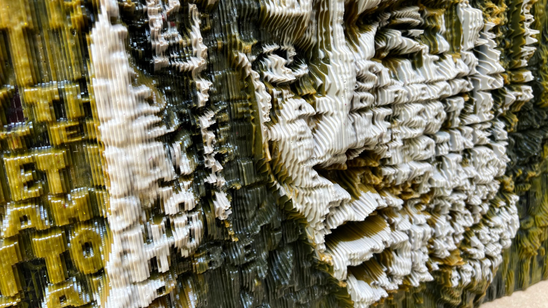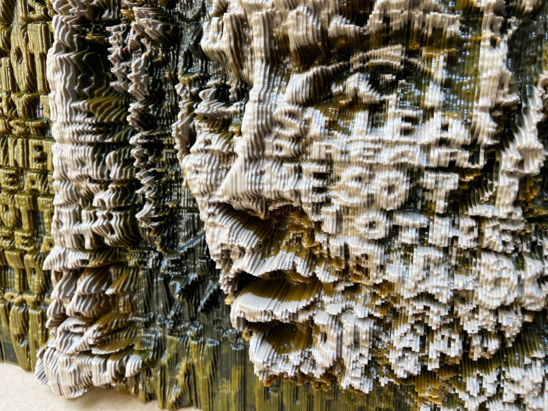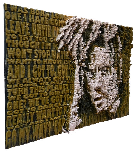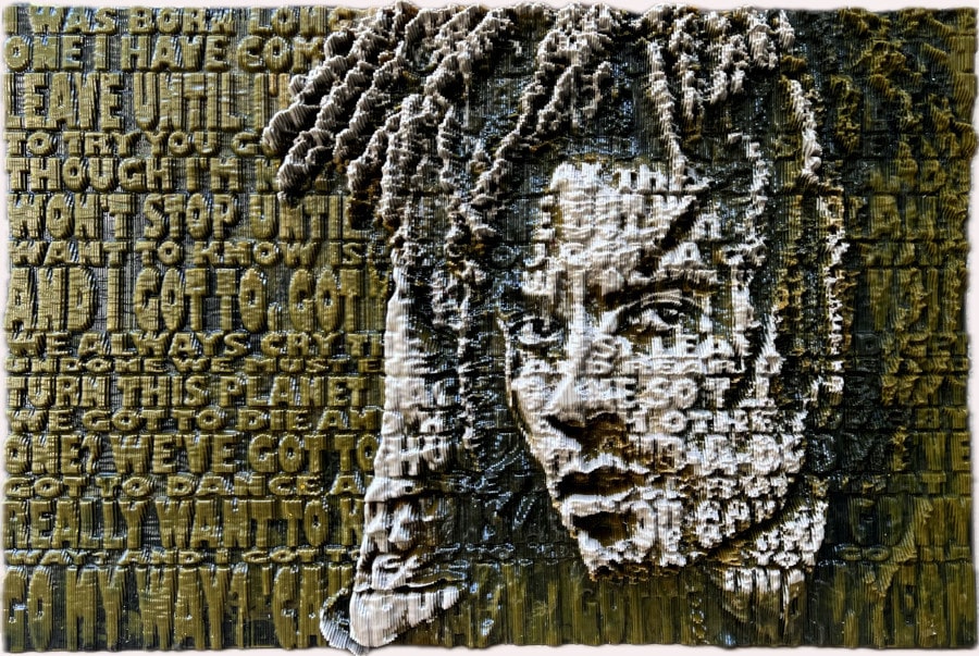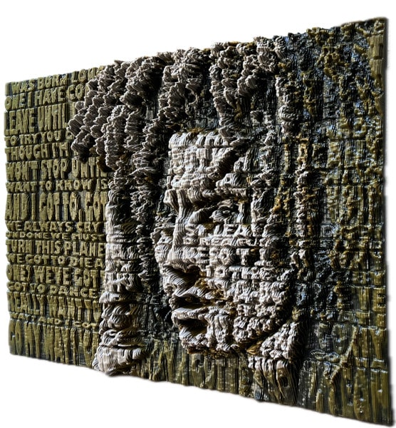 This hanging sculpture, Gonna Go My Way, features a portrait of Lenny Kravitz, which I created by embossing and recessing the lyrics to his iconic song “Are You Gonna Go My Way.” I meticulously crafted the three-dimensional face, carefully applying color to make it stand out and bring the piece to life. Through this work, I aimed to capture Kravitz’s vibrant energy and the rebellious essence of his music, using the lyrics that have shaped his legacy. This sculpture serves as my tribute to one of the most influential rock musicians of our time.