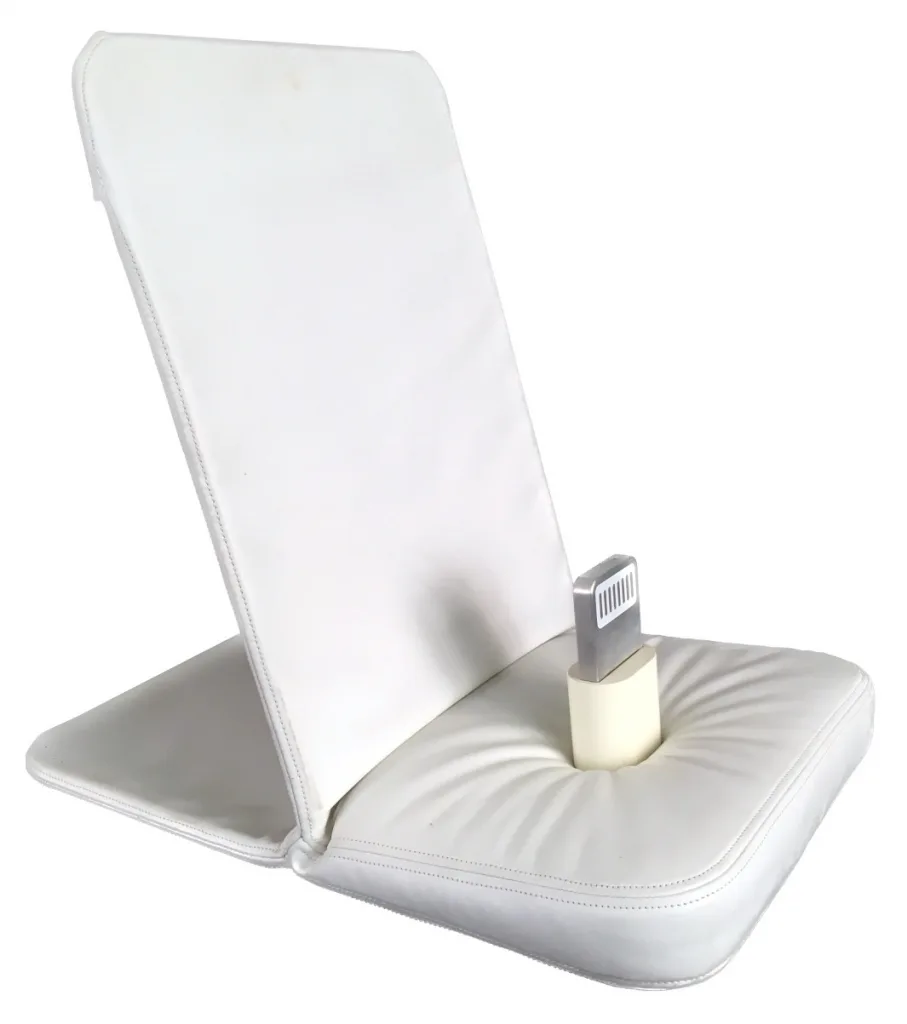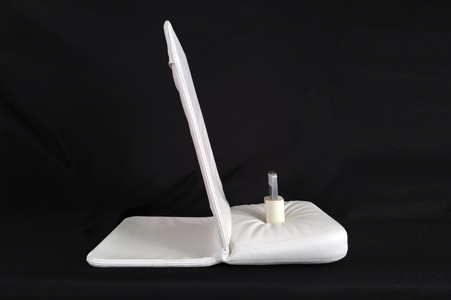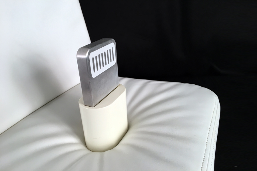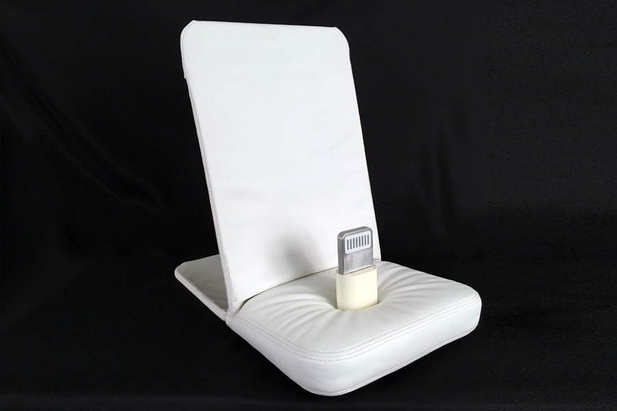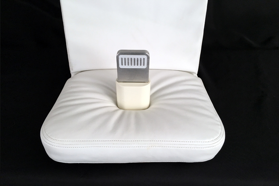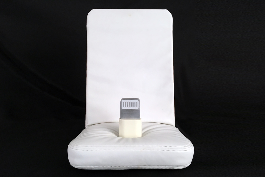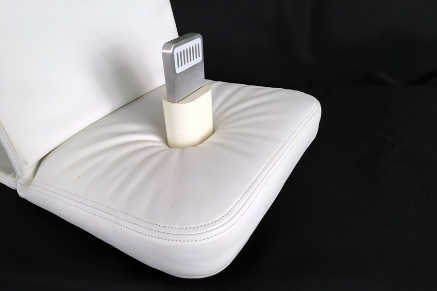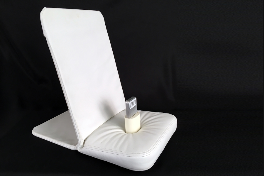 Felt the need to express the feeling experienced after each meditation session. Total rejuvenation and the feeling of being “charged” to be full again. Merging the well-known, large-scale lightning charger plug into the seat of a meditation chair. Transforming the meditation chair into a human charging dock. The use of white leather upholstery elevates the chair to a tech like device.