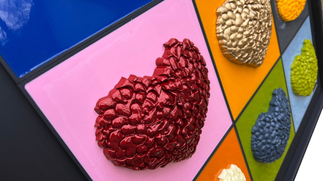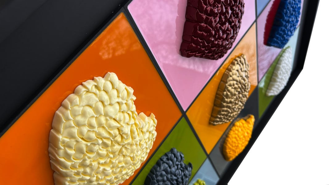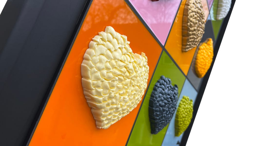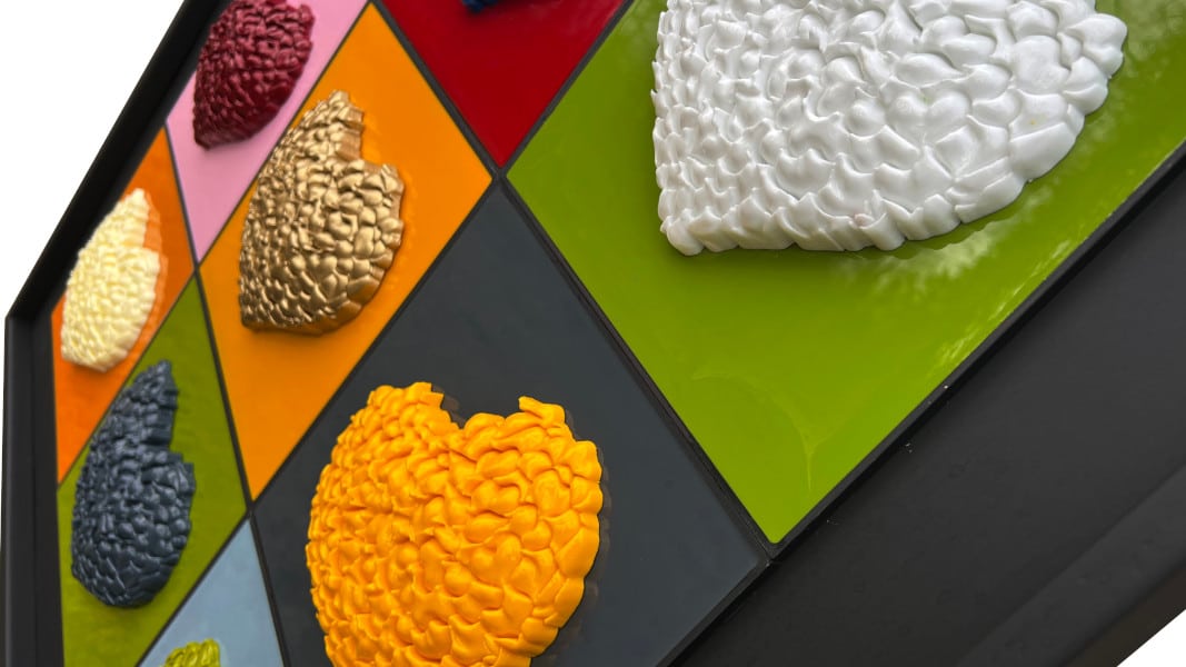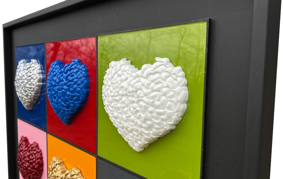 “Perfect No Love” is an exploration into the imperfections that define love and human relationships. This piece is composed of a 3 x 3 grid of tiles, each boasting a unique background color cast in epoxy, with a vibrant, textured heart at its center. These hearts are not singular entities but are intricately formed from numerous small hearts, which the artist refers to as a “Bouquet of Hearts.”