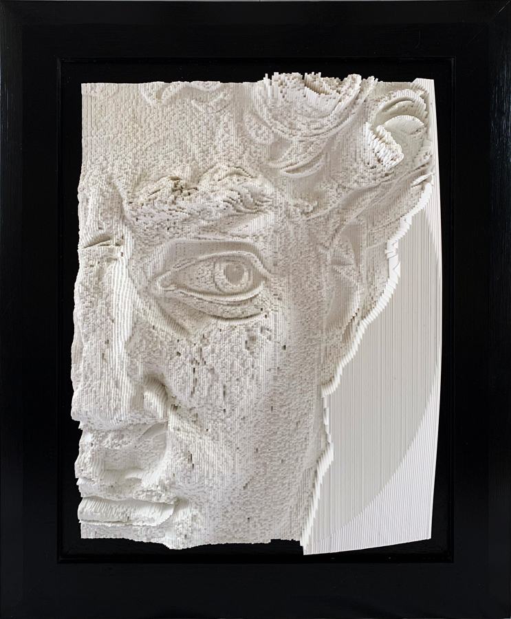 With this piece, I attempted to have my own interpretation of a small portion from Michelangelo’s David statue. Using the same technique of image manipulation and conversion back to 3D representation and compiling layers of 2D flats to a 3D object.