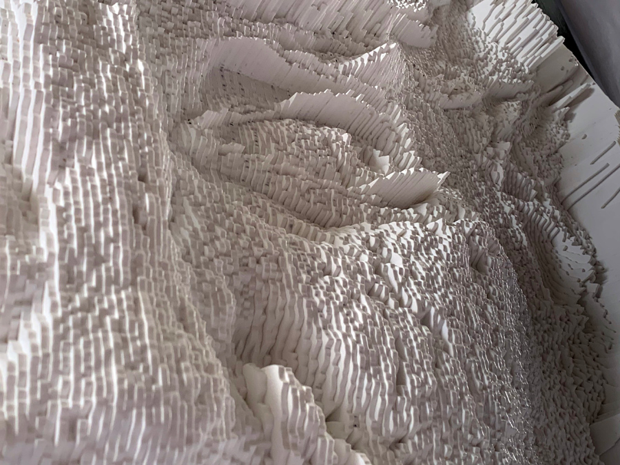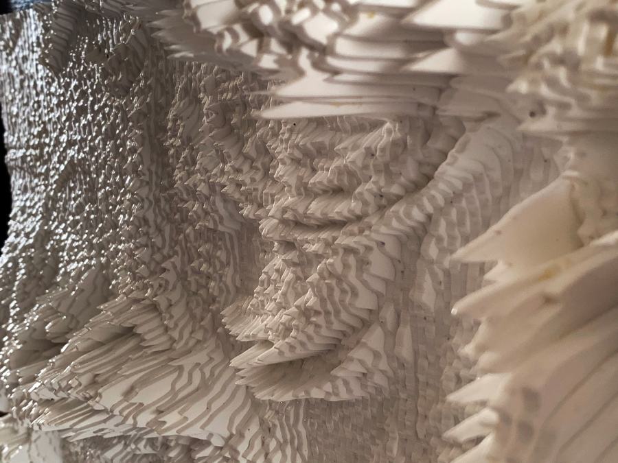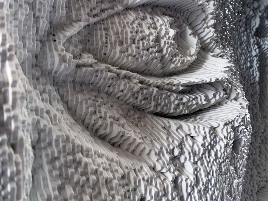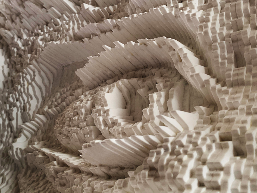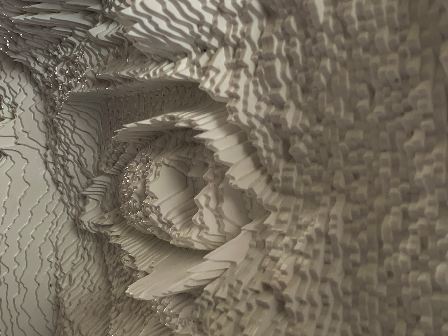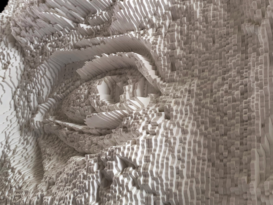 From up close, it is very hard to see the facial expression and to make any sense of it, as the topography of the piece ranges from extremely deep valleys to very high peaks. Only once one steps back he can see the clearer image as the light bounces from the peaks and shadow is cast into the deep valleys are composing together the facial expression.